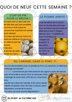 Les menus sont élaborés par la société SR COLLECTIVITES 81710 SAIX - SIRET 79385813500015 et consultables sur cette page.