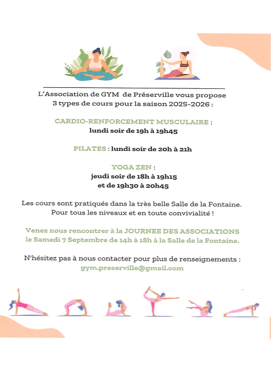 2025-2026 L'association " Gym Préserville" vous propose de la gymnastique adulte, du fitness et du Pilates.